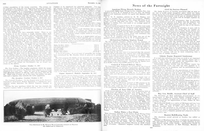 American Flying Records Broken A remarkable flight from Chicago to San Antonio, Tex., was completed by an L. W. F. biplane at 10 a. in., Nov. 13, during which several American records for speed and distance were shattered. An L. W. F. machine, piloted by H. W. Blakley, left Chicago on Sunday, Nov. 11, in a driving rainstorm.