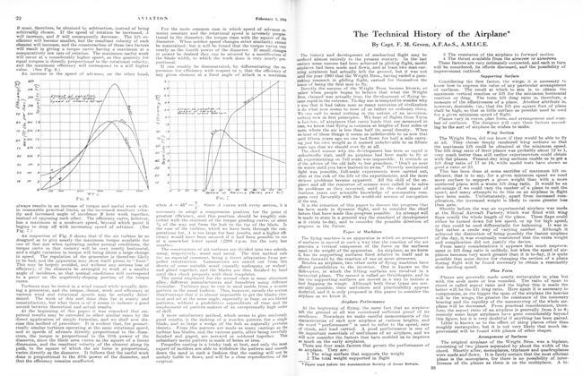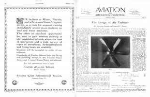 While air turbines have occasionally been used to pump gasoline from the main tank to an auxiliary, when it could feed by gravity, they were chosen for such purposes purely by a method of trial and error, and air turbine design did not really become important enough to warrant an attempt to establish it on scientific principles until the greatly extended use of radio apparatus, searchlights, stabilizer servomotors, etc., during the last few years, has made absolutely necessary the provision of satisfactory means, independent of the engine, for generating considerable quantities of electrical power.