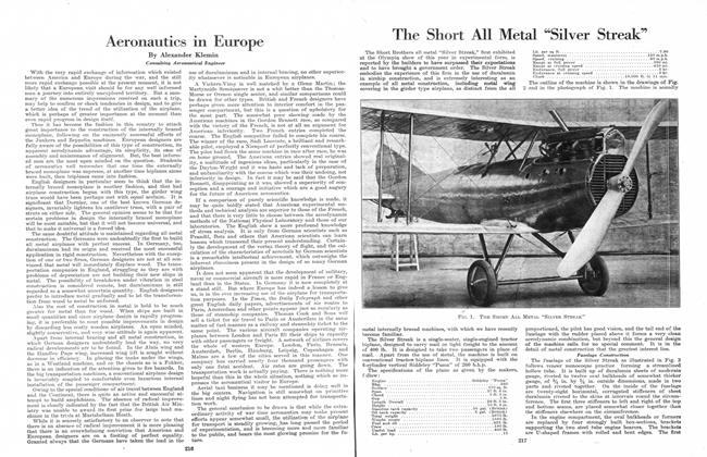 The Short Brothers all metal “Silver Streak,” first exhibited at the Olympia show of this year in experimental form, is reported by the builders to have surpassed their expectations and to have brought a government order. The Silver Streak embodies the experience of this firm in the use of duralumin in airship construction, and is extremely interesting as an example of all metal construction, including metal wing covering in the girder type airplane, as distinct from the all metal internally braced machines, with which we have recently become familiar.