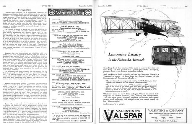 Germany—The invention of a wing-strain indicator by Klemperer, of Berlin, should prove of interest to the airplane industry. This instrument works on the theory of mass and weight pressure. When the plane is at equilibrium the indicator points to “1,” and when the component forces are increased the indicator moves correspondingly, warning the pilot that there is too great a pressure on the wings.