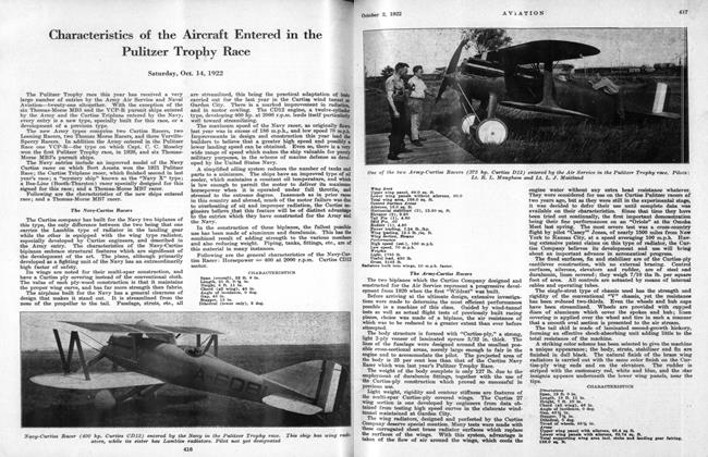 The Pulitzer Trophy race this year has received a very large number of entries by the Army Air Service and Naval Aviation—twenty-one altogether. With the exception of the six Thomas-Morse MB3 and the VCP-R pursuit ships entered by the Army and the Curtiss Triplane entered by the Navy, every entry is a new type, specially built for this race, or a development of a previous type.