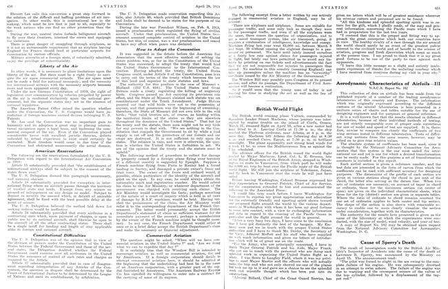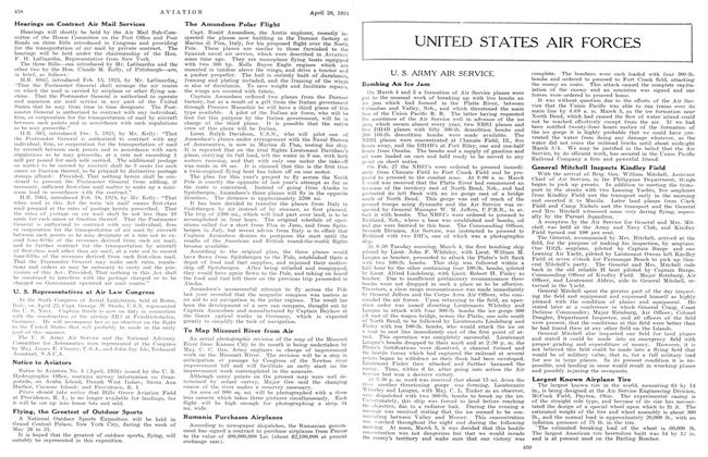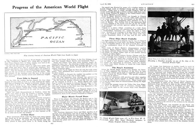The four planes of the American World Flight, commanded by Maj. Frederick L. Martin, A.S., which flew on April 10 from Prince Rupert, B.C., to Sitka, Alaska, were held at the latter place by bad weather until the 13th. On the 11th the airmen waged an eight hour battle with high winds and heavy seas to prevent the seaplanes New Orleans and Boston from being washed ashore and dashed to pieces.