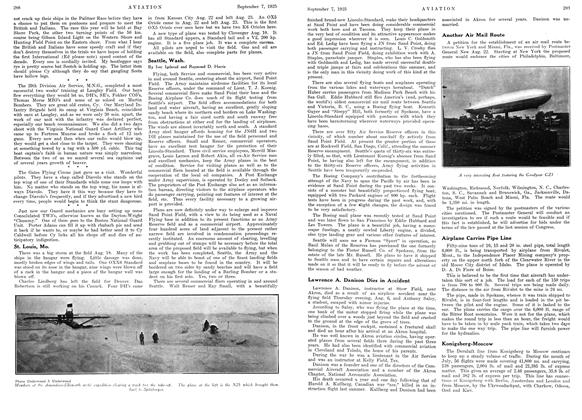 Flying, both Service and commercial, has been very active in and around Seattle, centering about the airport, Sand Point Field. The Army maintains airdrome facilities for its local Reserve officers, under the command of Lieut. T. J. Koenig.