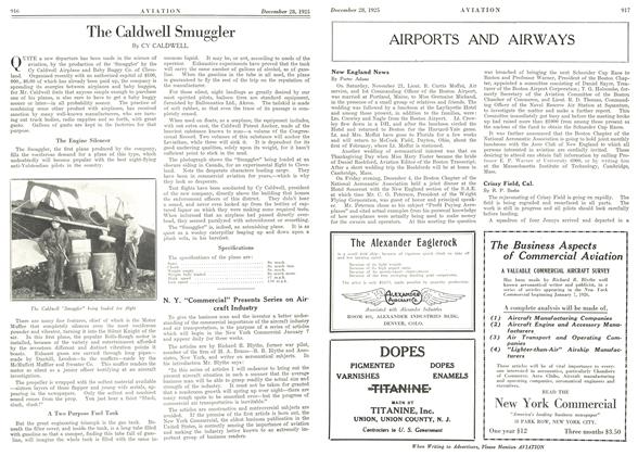 QUITE a new departure has been made in the science of aviation, by the production of the 'Smuggler’ by the Cy Caldwell Airplane and Baby Buggy Co. of Cleveland. Organized recently with an authorized capital of $100, 000., $6.00 of which has already been paid up, the company is spreading its energies between airplanes and baby buggies, for Mr. Caldwell feels that anyone simple enough to purchase one of his planes, is also sure to have to get a baby buggy sooner or later—in all probability sooner.
