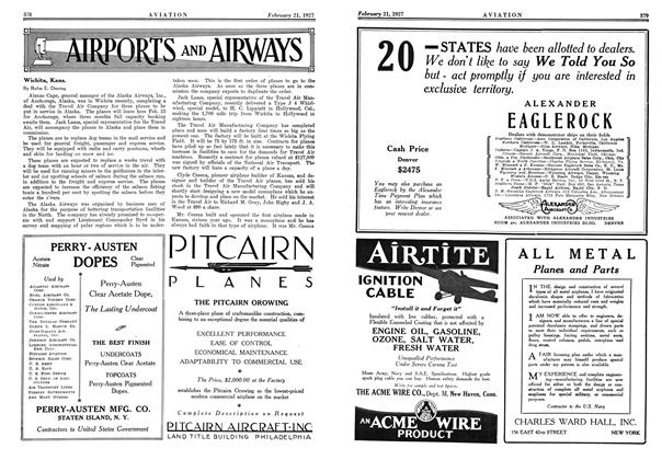 Alonzo Cape, general manager of the Alaska Airways, Inc., of Anchorage, Alaska, was in Wichita recently, completing deal with the Travel Air Company for three planes to be put in service in Alaska. The planes will leave here Feb. 15 for Anchorage, where three months full capacity booking awaits them.