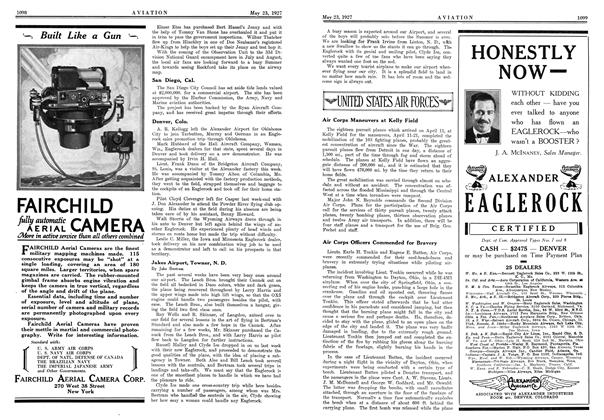 The eighteen pursuit planes which arrived on April 11, at Kelly Field for the maneuvers, April 11-21, completed the mobilization of the 103 fighting planes, probably the greatest concentration of aircraft since the War. The eighteen pursuit planes flew from Detroit in one day, a distance of 1,300 mi., part of the time through fog and storm ahead of schedule.