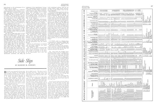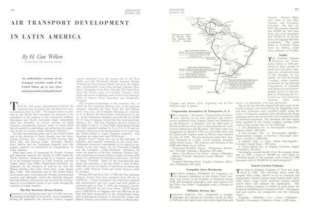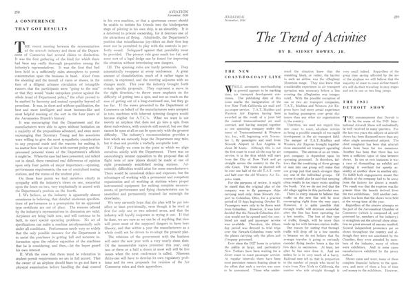 WHILE aeronautic merchandizing in general appears to be marking time, air transport development continues. The publishing date of this issue marks the inauguration of the first New York-California air mail and passenger service. T.A.T.-Maddux and Western Air Express having been awarded as the result of a joint bid the central transcontinental air mail contract, and having merged together as one operating company under the name of Transcontinental & Western Air, Inc., will, beginning with November 1, fly passengers and mail from Newark Airport to Los Angeles in about 36 hours.