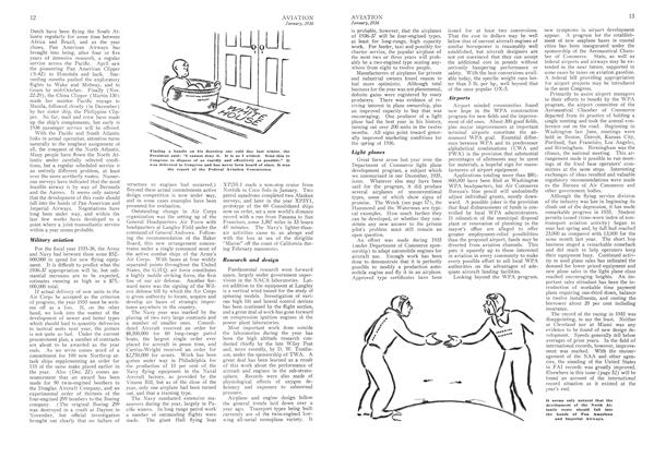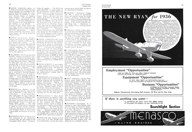 ALABAMA—The MONTGOMERY Municipal Airport project which has been allotted $102,153 of WPA funds will provide a radio station, additional aprons, runways, and other improvements. . . . The State Aviation Commission has been active in obtaining leases on sites for new airports in the 50 cities that will benefit from $1,300,000 in public works funds allotted the state by the comptroller general. . . . The Donaldson Flying Service of MONTGOMERY, which was taken over by Harry King, and is now known as the King Aircraft Service, has purchased a Fairchild 22, equipped for blind flying and radio training.