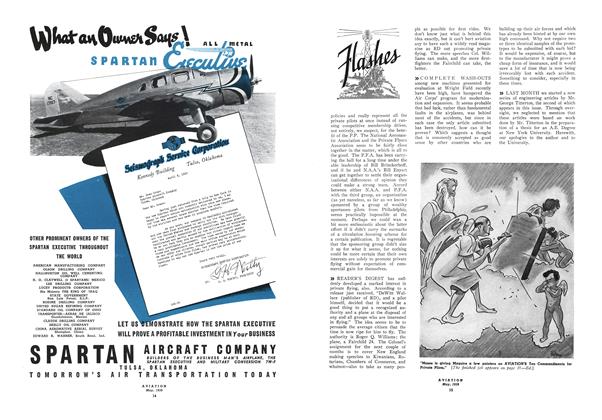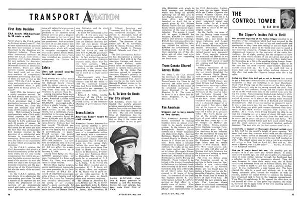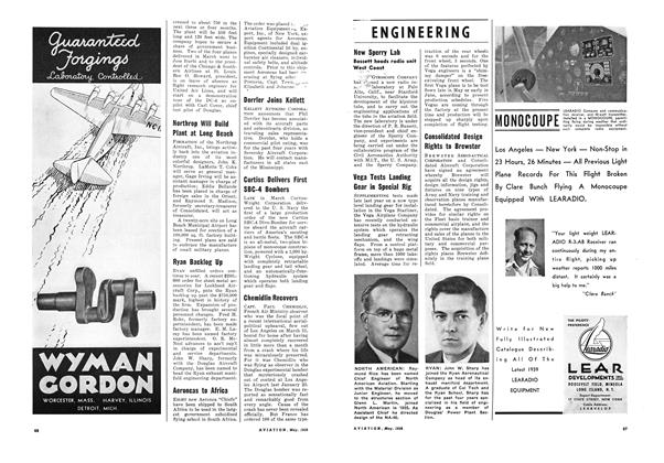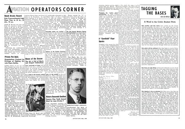 CLARE W. BUNCH took time out from his executive duties recently to fly one of his Monocoupes from Burbank, Calif., to Roosevelt Field breaking the previous transcontinental light plane record. He arrived after a flight of 23 hr., 27 min., and 10 sec., at 1:07:10 p.m., April 3.