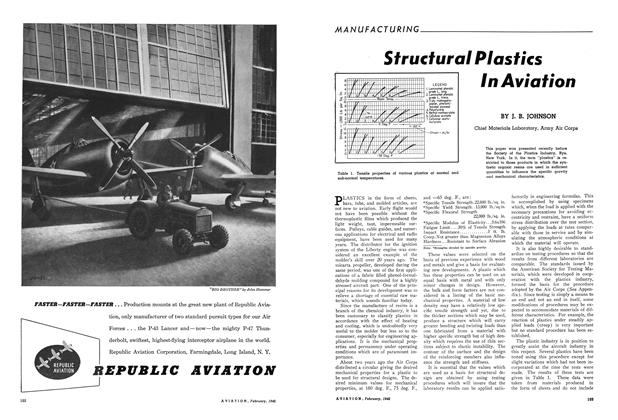 PLASTICS in the form of sheets, bars, tube, and molded articles, are not new to aviation. Early flight would not have been possible without the thermoplastic films which produced the light weight, taut, impermeable surfaces. Pulleys, cable guides, and numerous applications for electrical and radio equipment, have been used for many years.