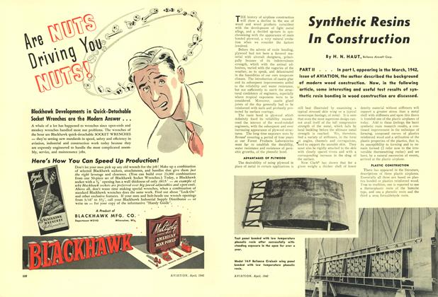 PART II . . . In part I, appearing in the March, 1942, issue of AVIATION, the author described the background of modern wood construction. Now, in the following article, some interesting and useful test results of synthetic resin bonding in wood construction are discussed.