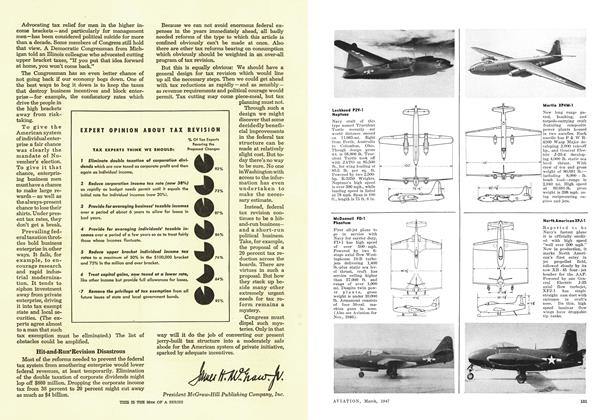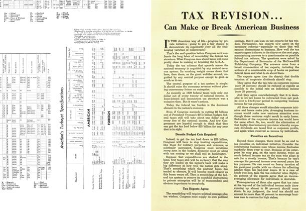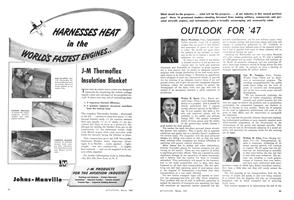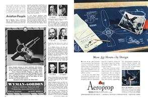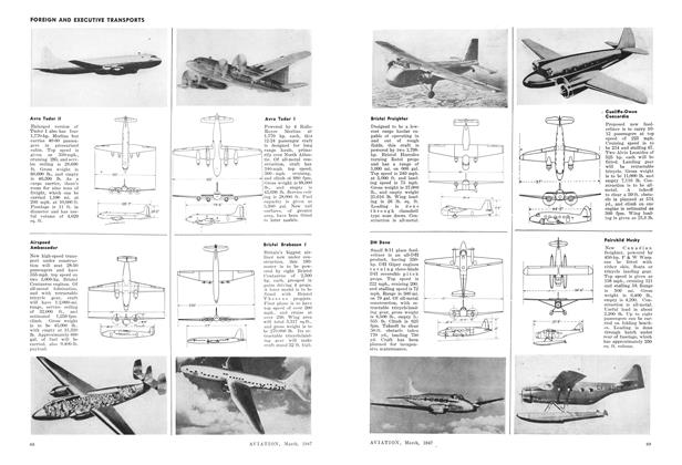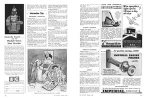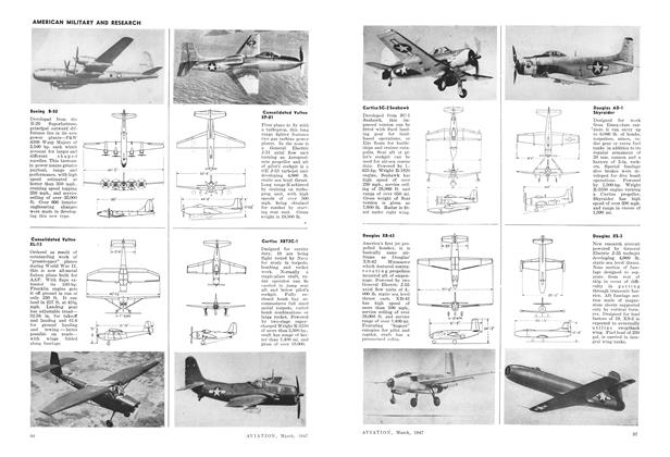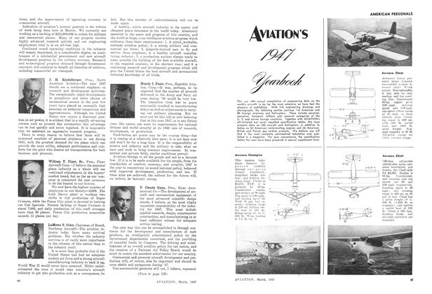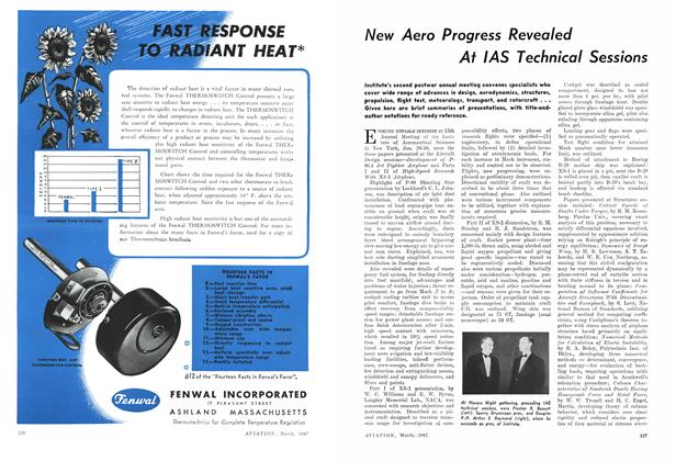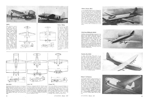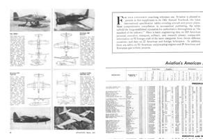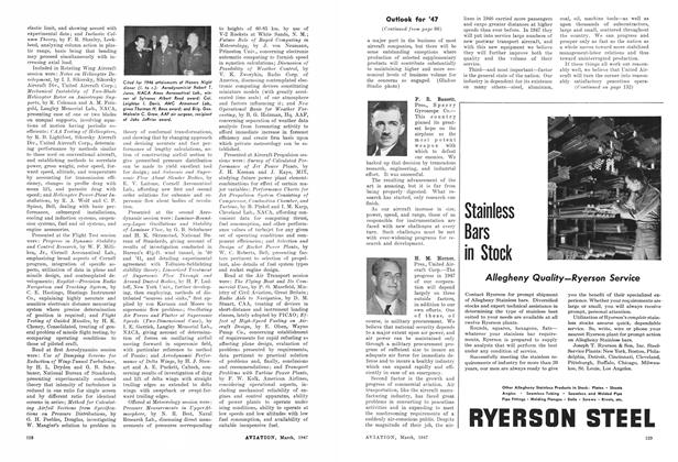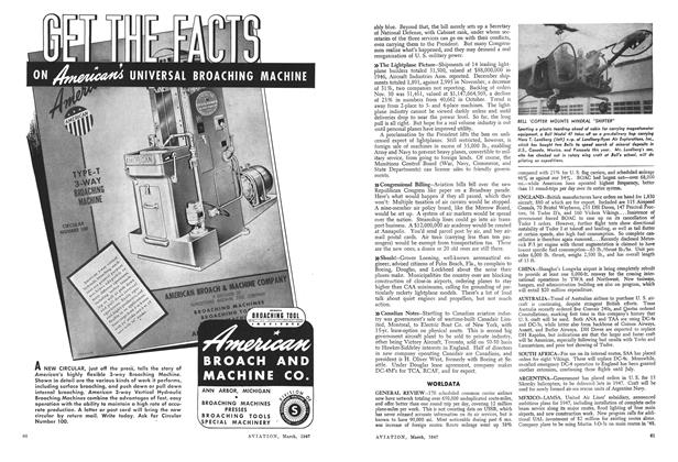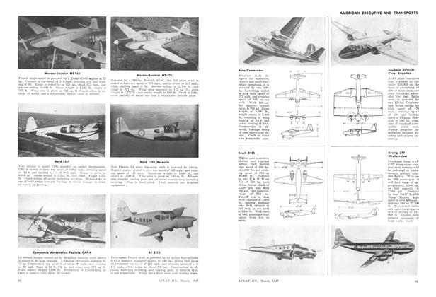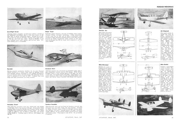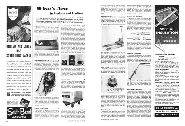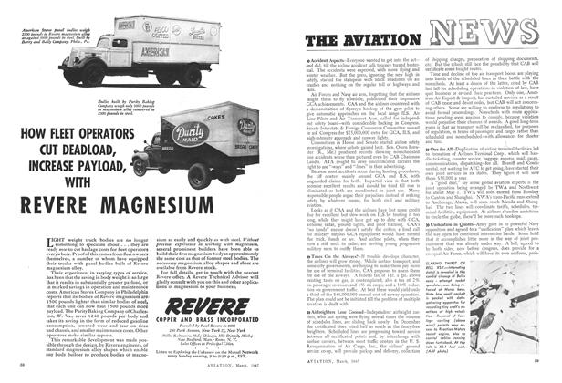 Having a length of 40 ft. 10 in., depth of 29 ft. 6 in., and height of 9 ft. 4 in., and affording a floor space of 800 sq. ft., new “Mono-T”, all-aluminum semimonocoque T-shaped hangar for housing lightplanes has been designed by Unit Fabrication Co., Los Angeles.