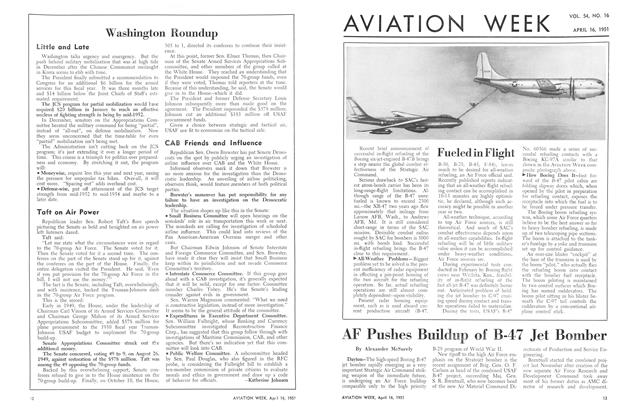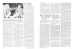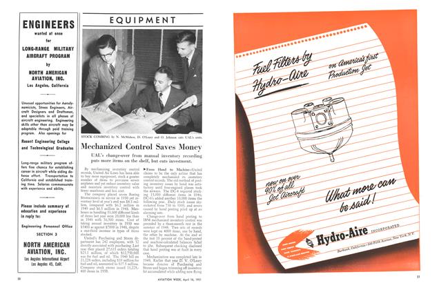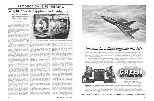 These first pictures of the Westinghouse J-40-WE-6, one of the recently announced turbojets in the high-thrust bracket, show front end (left photo) and side features of the engine. Gearbox is disposed between twin elliptical air intakes, with what appear to be fuel pumps and fuel regulator installed below and forward.