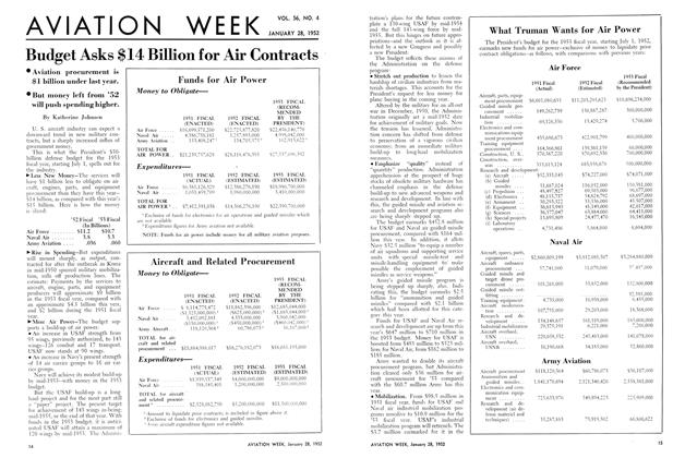 The President’s budget for the 1953 fiscal year, starting July 1, 1952, earmarks new funds for air power—exclusive of money to liquidate prior contract obligations—as follows, with comparisons with previous years: Air Force Aircraft, parts, equipment procurement Guided missile procurement ......