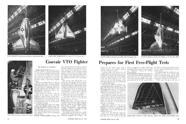 Moffett Field, Calif.—Convair’s revolutionary XFY-1 vertical takeoff fighter was poised for free-flight trials last week after more than 20 “tethered” tests during which the startling new aircraft (AVIATION WEEK Mar. 22, p. 14) actually flew inside a giant Navy dirigible hangar.