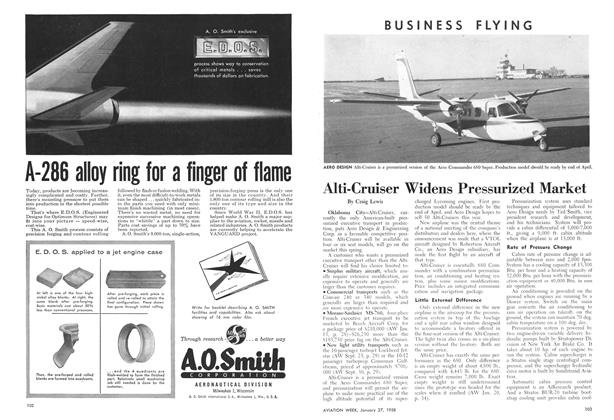 Oklahoma City—Alti-Cruiser, currently the only American-built pressurized executive transport in production, puts Aero Design & Engineering Corp. in a favorable competitive position. Alti-Cruiser will be available in four or six seat models, will go on the market this spring.
