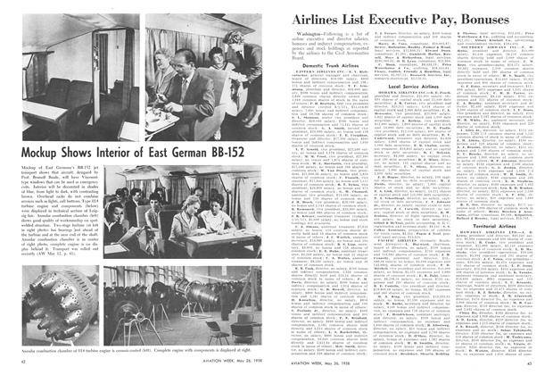 Washington—Following is a list of airline executive and director salaries, bonuses and indirect compensation; expenses and stock holdings as reported by the airlines to the Civil Aeronautics Board. Domestic Trunk Airlines EASTERN' AIRLINES IXC.—E. V. Rickenbaeker, general manager and chairman, board of directors, $50,000 salary, $900 bonus and indirect compensation and 106,173 shares of common stock; T. F. Armstrong, president and director, $35,000 salary, $900 bonus and indirect compensation, 2,609 common shares directly owned and I, 040 common shares of stock in the name of others ; I’. H. Brattain, first vice president and director (retired 6/1/57), $15,416.60 salary, 7,600 bonus and indirect compensation and 19,768 shares of common stock; S. L. Shannon, senior vice president and director, $30,000 salary, $900 bonus and indirect compensation and 11,445 shares of common 'stock ; G. A. Smith, second vice president, $20,000 salary, no bonus and 416 shares of common stock ; T. E. Creighton, treasurer and director, $17,500 salary, $900 bonus and indirect compensation and 1,040 shares of common stock.