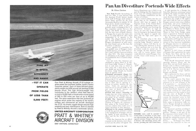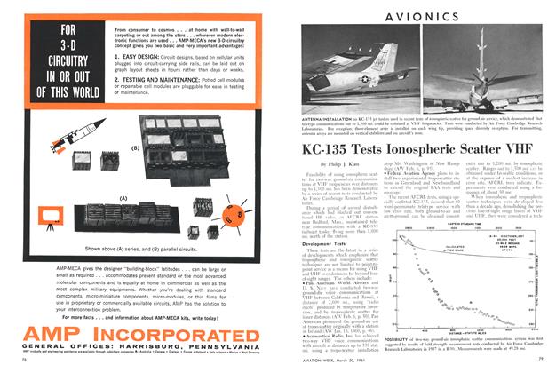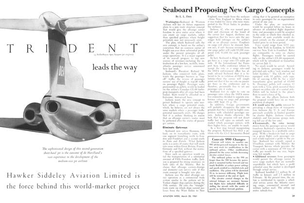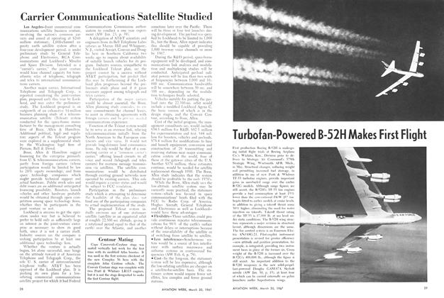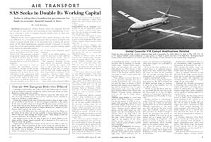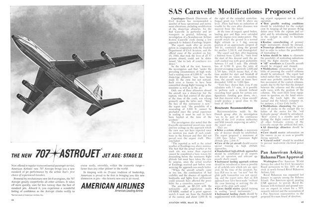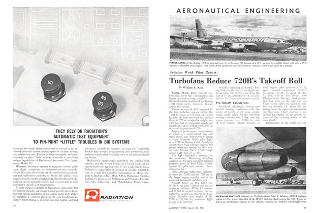Seattle, Wash.—Better takeoff performance, lower fuel consumption and higher payload-carrying capability are the most notable features of the Boeing 720B which enters American Airlines service this month. Thrust increase of 40% supplied by the four turbofan engines enable the 720B to cruise at 630 mph. at 25,000 ft., take off from one-third less runway than the 720 at comparable weight, use 20% less fuel at comparable speeds and operate at a gross weight 20,000 lb. in excess of its predecessor 720.