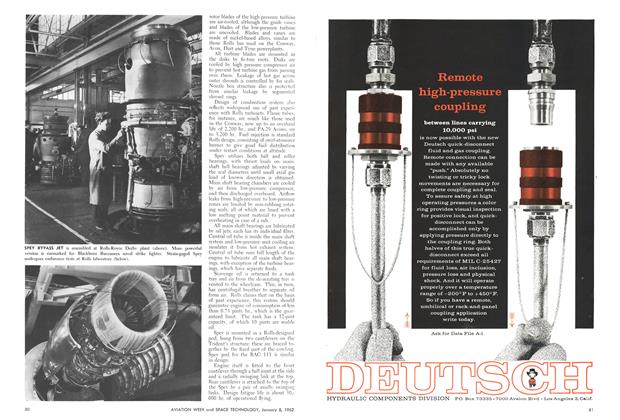 London—Rolls-Royce Spey turbojet engine, powerplant for the cle Havilland Trident three-jet transport and the BAC 111 twin-jet airliner, has drawn on extensive Avon and Conway experience in its development program. The engine, now in the 10,000-lb.thrust class, has accumulated more than 100 hr. of flight time in Avro Vulcan testbeds.