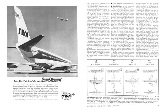 Speyer, West Germany—Ernst Heinkel Flugzeugbau is offering two new feeder liner proposals, one a 24-passenger turbojet, the other a 25-passenger turboprop, as basic Douglas DC-3 type replacements, with a particular eye upon German Deutsche Lufthansa and potential markets in Europe and the U. S.