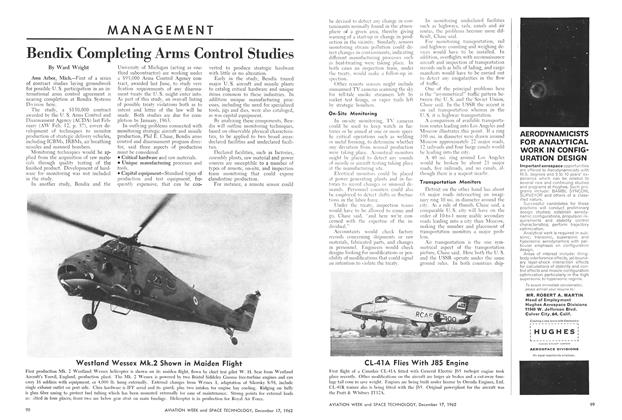 Ann Arbor, Mich.—First of a series of contract studies laying groundwork for possible U. S. participation in an international arms control agreement is nearing completion at Bendix Systems Division here. The study, a $150,000 contract awarded by the U. S. Arms Control and Disarmament Agency (ACDA) last February (AW Feb. 12, p. 37), covers development of techniques to monitor production of strategic delivery vehicles, including ICBMs, IRBMs, air breathing missiles and manned bombers.