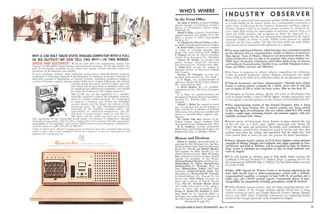 Cover—Ron Appelbe for Aviation Week; 22—Breguet; 24—Donald Winston,28—British Aircraft Corp.; 29—Cecil Brownlow for Aviation Week; 34—General Dynamics/Convair; 39—Autonetics Div., North American Aviation43 Hughes Aircraft Co. (top), North American-Autonetics (bot.); 47—TRG, Inc.; 50—General Electric; 56—Tass (top) Donald Winston (bot.); 57—Ron Appelbe for Aviation Week (top), Tass (center, bot.); 58—UPI (top) Donald Winston (bot.); 59, 60—Donald Winston; 63—USAF; 64, 65—NASA; 67—Phi Ico Corp.; 68—U.