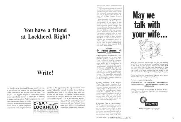 Los Angeles—Potential of laser communications for achieving high information rates in deep-space communications appears to be growing, compared with microwave techniques, which may be nearing the limits of their performance. This and other considerations affecting communications with space vehicles over interplanetary distances during the next decade will be discussed and evaluated this week at the winter convention of aerospace and electronic systems, opening at the International Hotel here Feb. 2.