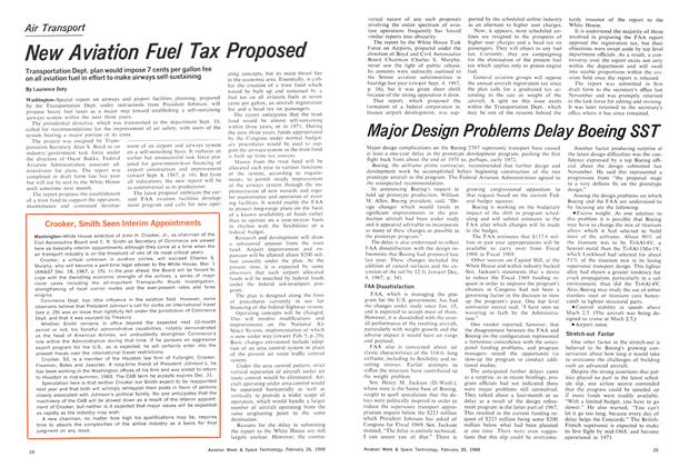 Major design complications on the Boeing 2707 supersonic transport have caused at least a one-year delay in the prototype development program, pushing the first flight back from about the end of 1970 to, perhaps, early 1972. Boeing, the airframe prime contractor, recommended that further design and development work be accomplished before beginning construction of the two prototype aircraft in the program.