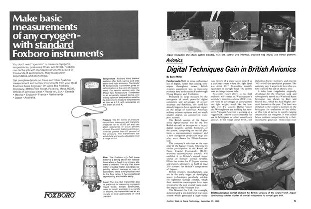 Farnborough-Shift to more widespread use of digital, rather than analog, techniques throughout newer British avionics equipment was in increasing evidence here at the recent Farnborough Flying Display and Exhibition. Prompted in large measure by the emergence of small, powerful digital computers and advantages of greater accuracy and flexibility, this trend has already begun to have significant impact on the design of numerous American military avionics systems and, to a much smaller degree, on commercial transport systems.