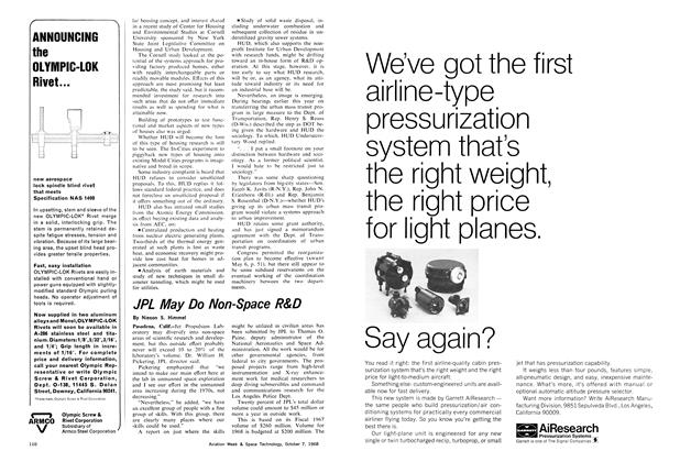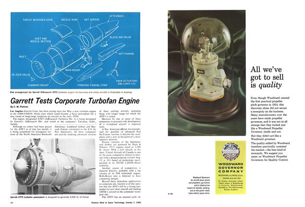 Los Angeles—Garrett Corp. has been testing since last May a new turbofan engine in the 4,000-5,000-lb. thrust class which could become a basic powerplant for a new round of long-range corporate jet aircraft in the early 1970s. The engine, designated ATF3 (AiResearch Turbofan No. 3) is being developed by Garrett’s AiResearch Div. and tested at the company’s Torrance, Calif., facility.
