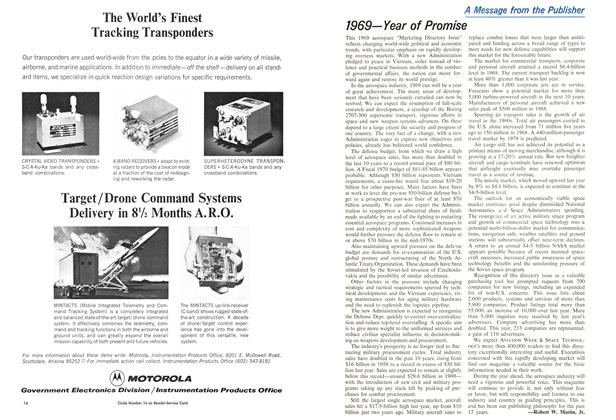This 1969 aerospace “Marketing Directory Issue” reflects changing world-wide political and economic trends, with particular emphasis on rapidly developing overseas markets. With a new Administration pledged to peace in Vietnam, order instead of violence and practical business methods in the conduct of governmental affairs, the nation can move forward again and restore its world prestige.