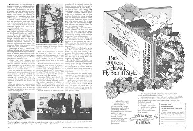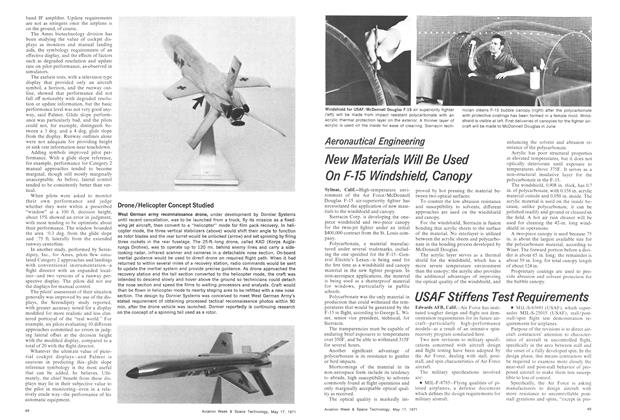 Moffett Field, Calif.-Pilot making a low visibility approach may in the future obtain at least a partial view of the airport from an airborne microwave radiometer scanning forward and down across the runway from his airplane. The radiometer output would be processed,formatted and displayed in the cockpit as a pictorial representation of the runway and its environs. The ground scene depicted in the display will lack the detail of direct visual observation, but could portray such key features as approach lights, runway outline, touchdown point and the presence of other aircraft or surface vehicles on the runway. The scale and perspective of the displays will change in the same way as the pilot's view through the windscreen in clear weather. Advocates of visual landing aids that function independently of the instrument landing system (ILS) maintain that these aids are needed to establish pilot confidence in the performance of advanced landing systems being designed and implemented for Category 2 and 3 operations. These visual aids, generically called independent landing monitors (ILM), also are needed, their proponents say, to give the pilot the visual cues he needs if he must assume manual control close to the ground under instrument landing conditions. The ILM concept has been strongly recommended, for example, by the allweather flying committee of the Air Line Pilots Assn, (AW&ST, July 27, 1970, P27). The National Aeronautics and Space Administration’s Ames Research Center is studying the feasibility of a radiometric ILM, and plans to begin testing a 37-gc. system in about a year. The frequency is one at which electromagnetic radiation can penetrate atmospheric moisture that reduces or blocks human vision. Another radiation “window,” at 94 gc., was considered and rejected in earlier trade studies. The shorter wavelength at that frequency would result in higher image resolution and permit the use of a smaller antenna, but signal attenuation is greater, and device development less advanced at the higher frequency. The Ames study, which will include both ground and flight tests using an Aerojet General Corp. radiometer, is designed to determine whether, and under what conditions a radiometer is an appropriate sensor for an ILM. Some of the questions to be answered as a result of the study are: ■ Whether the radiometer will function as predicted at the 3-10-deg. grazing angles encountered during fixed and rotary wing aircraft approaches. Most radiometric viewing of the earth to date has been from high altitude aircraft and satellites at a viewing angle of nearly 90 deg. ■ The effects of changing weather conditions and signal polarization. The antenna to be used in the test program will detect horizontally polarized signals only. ■ What kind of system performance can be obtained when sensing natural radiation only, and how that performance may be upgraded by supplementary illuminators and passive reflectors on thep ground. Passive reflectors pointed at the cold sky could outline a runway or mark features such as the touchdown point. They would have to be large enough to be visible to the radiometer and be provided with suitable means of maintaining their reflectivity. Discrete low power emitters could be very effective for outlining the runway, said John Dimeff, chief of the instrumentation division at Ames. He predicted that low-cost, low-power solid state sources using Gunn or Impatt oscillators would become available at a cost at least an order of magnitude lower than Category 2 runway lights. Milliwatt sources with a small horn probably could be picked up at 5-10-mi. ranges, and possibly could be built into runway lighting pods, he suggested. Additional emitters could be deployed on the landscape to facilitate alignment with the runway. The use of such emitters to outline the runway is similar in concept to the Bendix Micro-Vision system. However, a radiometric ILM could remain operative outside the range of the emitters-in a taxiing mode, for example—and its wide bandwidth should eliminate problems with overflights, fading and signal coherence, Dimeff said. Another type of supplementary illumination that will be considered is microwave “floodlighting” over the runway or a broader area of the airport. Basically, a radiometer is a sensitive, special purpose radio receiver capable of accurately measuring low intensity signals. Unlike radar, which also is being advocated and developed for the ILM function, the radiometer is a completely passive instrument. It senses forward scattered energy emitted or reflected from objects within its field of view. Present equipment is expensive, primarily because of low volume, but in quantity production, an ILM radiometer should cost less than a comparable radar, said an Aerojet spokesman. The radiometer does not require a transmitter section, and it acquires information with essentially the same perspective as the pilot’s eye. Therefore, it is less complicated to process the radiometer output for the display. Because the radiometer is a passive sensor, it will not produce spurious signals in other nearby receivers. On the other hand, a large number of aircraft operating ILM radars in the vicinity of a busy airport could create an electromagnetic interference problem, said Richard Olson, advanced development manager at Aerojet’s Microwave Div. All objects not at absolute zero temperature emit random electromagnetic energy continuously as thermal noise. Because different materials radiate energy at different intensities, they can be distinguished by the radiometer according to their apparent, or brightness temperature. Metal objects are reflectors rather than emitters, and therefore appear at the temperature of the objects they retlect—cold, if on a runway reflecting the cold sky. The brightness temperature of nonmetals depends on the object’s actual temperature—as sensed by a thermometer—and dielectric constant, and the frequ