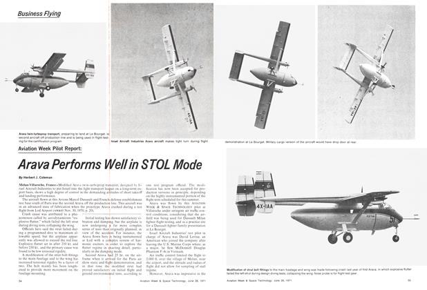 Melun-Villaroche, France—Modified Arava twin-turboprop transport, designed by Israel Aircraft Industries to put Israel into the light transport league on a long-term export basis, shows a high degree of control in the demanding attitudes of short takeoff and landing performance.