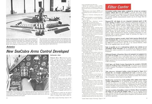 Patuxent River, Md.—Improved armament control system for Marine Corps/Bell AH-1J SeaCobra helicopters applies microcircuit logic programing to enhance weapons systems management, delivery capabilities and flexibility. The new system’s cockpit-mounted controller and remotely-located programer permit Marine Corps pilots to trigger selectively from any or all of four underwing stations a variety of weapons, including almost any combination of pods, launchers or droppable stores used to fulfill the SeaCobra’s missions of landing zone preparation, helicopter escort and fire suppression.