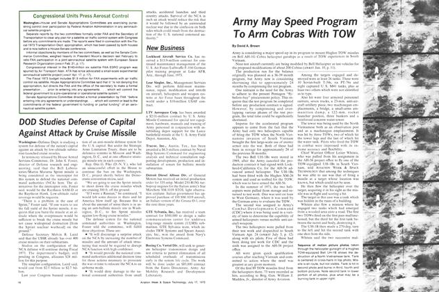 Army is considering a major speed-up in its program to mount Hughes TOW missiles on Bell AH-1G Cobra helicopter gunships as a result of TOW experiences in South Vietnam. Nine test aircraft currently are being modified by Bell Helicopter as test vehicles for the proposed modifications of about 200 Cobras (AW&ST Jan. 10, p. 11).