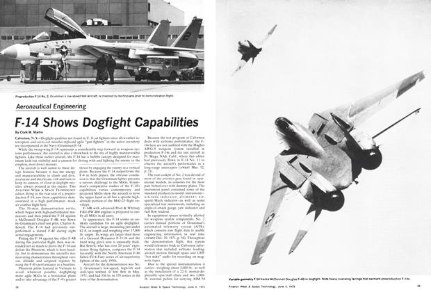 Calverton, N. Y.—Dogfight qualities not found in U. S. jet fighters since all-weather interceptors and air-to-air missiles replaced agile “gun fighters” in the active inventory are incorporated in the Navy/Grumman F-14. While the swing-wing F-14 represents a considerable step forward in weapons systems performance, the aircraft is also a throwback to the era of highly maneuverable fighters.