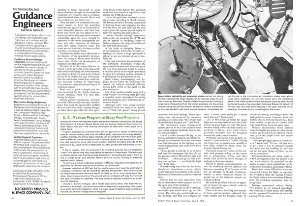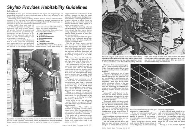 Washington—Manned space stations of the future will require few design changes for man to work comfortably in zero-g operations, based on the 171-day occupancy of the Skylab workshop by nine astronauts. Habitability studies carried out during the three missions involved substantial documentation of life on board Skylab and will enable an accurate assessment of the adequacy of design from this standpoint, according to Robert L. Bond, principal investigator for Skylab crew activities and maintenance studies.