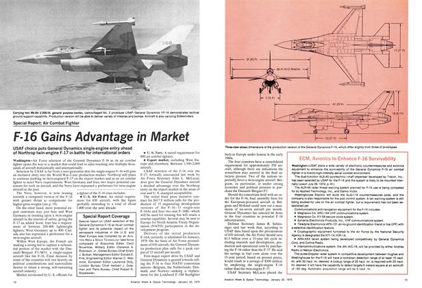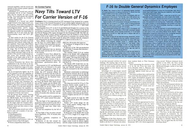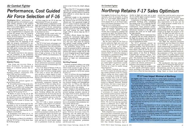 Washington—Better performance in flight tests and less cost combined to generate USAF’s selection of the General Dynamics YF-16 lightweight fighter as the F-16 air combat fighter over its competitor, the Northrop YF-17. The Air Force selected the YF-16 because it outperformed its competitor and is about 8% cheaper than the Northrop entry, according to Lt. Gen. William J. Evans, Air Force deputy chief of staff for research and development.