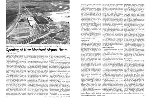 Montreal—Flight operations at the new $325-million Montreal International Airport at Mirabel are scheduled to begin Nov. 30 with the transfer of international flights from Dorval Airport. The opening—originally scheduled for Oct. 23—had been postponed because of incomplete electrical power mains, cargo facilities and flight kitchens (AW&ST Oct. 27, p. 23).