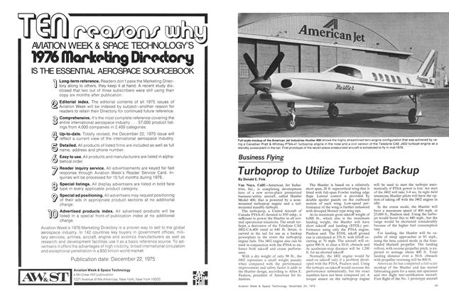 Van Nuys, Calif.—American Jet Industries, Inc., is completing development here of a new seven-place pressurized business/utility aircraft, called Hustler Model 400, that is powered by a nose-mounted turboprop engine and a tail-mounted standby turbojet.