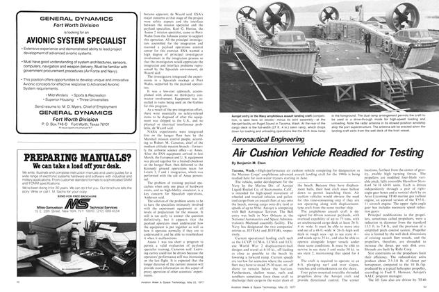 Tacoma, Wash.—High-performance air cushion vehicle competing for designation as the Marines Corps’ amphibious advanced assault landing craft for the 1980s is being readied here for over-water tryouts starting in June. The vehicle, under development for the Navy by the Marine Div. of Aerojet Liquid Rocket Co. of Sacramento, Calif., is intended for high-speed movement of wheeled and tracked vehicles and palletized cargo from an assault fleet at sea onto the beach, moving cargo onto dry land at speeds of up to 50 kt. Aerojet is competing with Bell Aerospace Textron.
