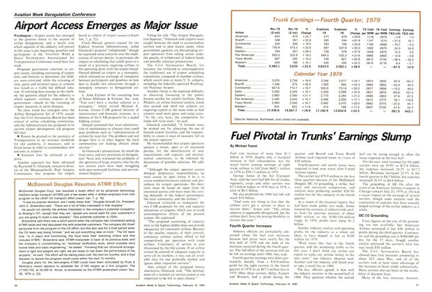 Fuel cost increase of more than $1.5 billion in 1979, despite only a marginal increase in fuel consumption, was the major factor causing earnings of eight trunk airlines to fall from $642.1 million in 1978 to $281.5 million in 1979. George James of the Air Transport Assn, said the total fuel bill for all trunks, regionals, cargo and other carriers was $2.3 billion higher in 1979 than in 1978, a total of $6.5 billion.