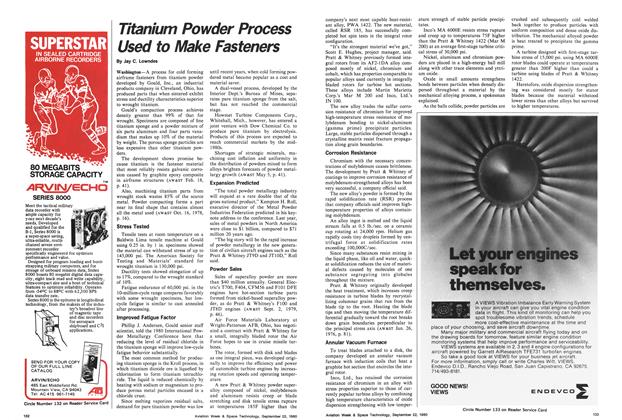 Washington—A process for cold forming airframe fasteners from titanium powder developed by Gould, Inc., an industrial products company in Cleveland, Ohio, has produced parts that when sintered exhibit stress and ductility characteristics superior to wrought titanium.
