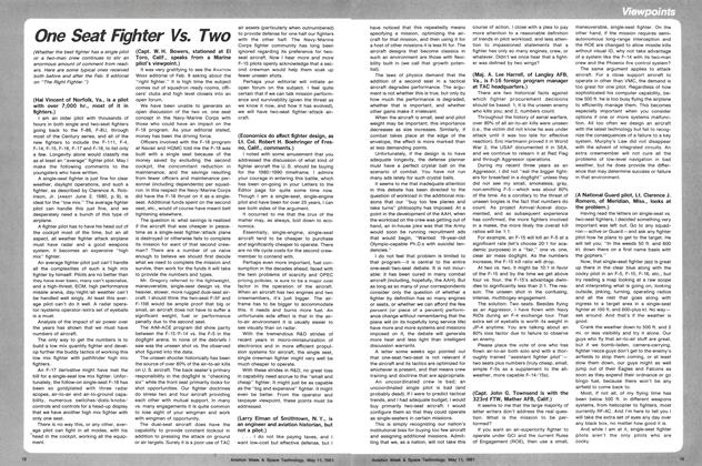 (Hal Vincent of Norfolk, Va., is a pilot with over 7,000 hr., most of it in fighters.) I am an older pilot with thousands of hours in both single and two-seat fighters going back to the F-86, F-8U, through most of the Century series, and all of the new fighters to include the F-111, F-4, F-14, F-15, F-16, F-17 and F-18, to list only a few.