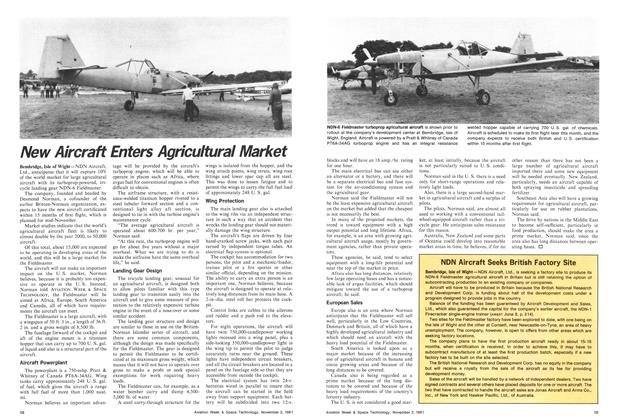 Bembridge, Isle of Wight—NDN Aircraft, Ltd., anticipates that it will capture 10% of the world market for large agricultural aircraft with its turboprop-powered, tricycle landing gear NDN-6 Fieldmaster. The company, founded and headed by Desmond Norman, a cofounder of the earlier Britten-Norman organization, expects to have the new aircraft certificated within 15 months of first flight, which is planned for mid-November.
