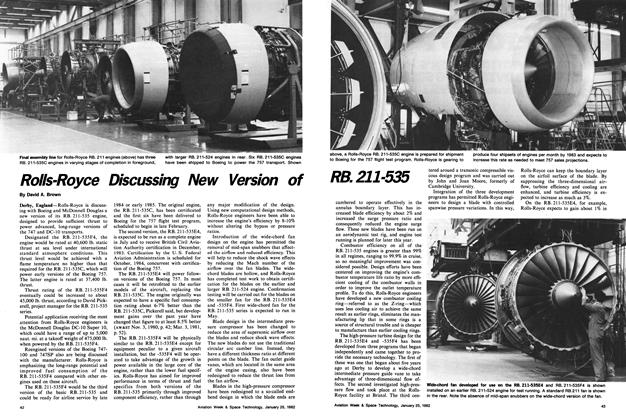 Derby, England—Rolls-Royce is discussing with Boeing and McDonnell Douglas a new version of its RB. 211-535 engine, designed to provide sufficient thrust to power advanced, long-range versions of the 747 and DC-10 transports. Designated the RB. 211-535F4, the engine would be rated at 40,600 lb.