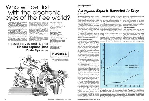 Washington—Aerospace exports will decline in 1982 for the first time in seven years, but a greater share of concern focuses on general aviation aircraft, where imports exceeded exports in 1981 by 16%. In 1982, the general aviation trade deficit is projected to exceed 45%.