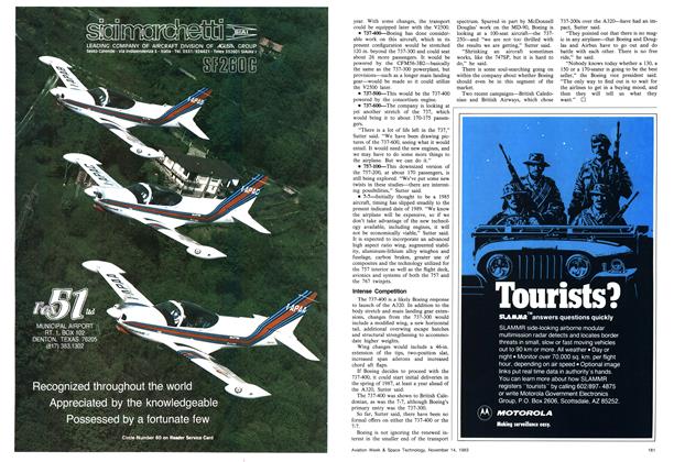Renton, Wash.—Boeing Co. is juggling a number of commercial transport programs in an attempt to gauge a market that no longer is specifying a certain aircraft size as the next airline requirement. Near-term emergence of a 150-seat transport is no longer certain, despite the four years Boeing has devoted to studying its proposal—termed the 7-7—and the progress Airbus Industrie has made in hydraulic actuators (projecting from the test rig), connecting beams and pressure pads, such as those on the vertical fin. The circumferential and longitudinal stripes on the fuselage are areas over which the protective coating has been stripped to permit the inspection of rivets during the test. The horizontal stabilizer, wing trailing-edge flaps and landing gear were tested separately from the main test article. The flaps and stabilizer were tested for two lifetimes, the main landing gear for three, and the nose gear for five. pushing its A320 entry, according to Boeing officials.
