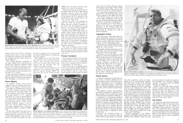 Johnson Space Center—Space shuttle Mission 41-G set for launch about Oct. 5 on the orbiter Challenger is the most ambitious U. S. Earth survey manned space flight planned since the Skylab space station 10 years ago. In addition to the Earth survey mission, the nine-day flight will be the first to demonstrate space shuttle orbital tanker hardware that could be used to refuel Landsat and other spacecraft.