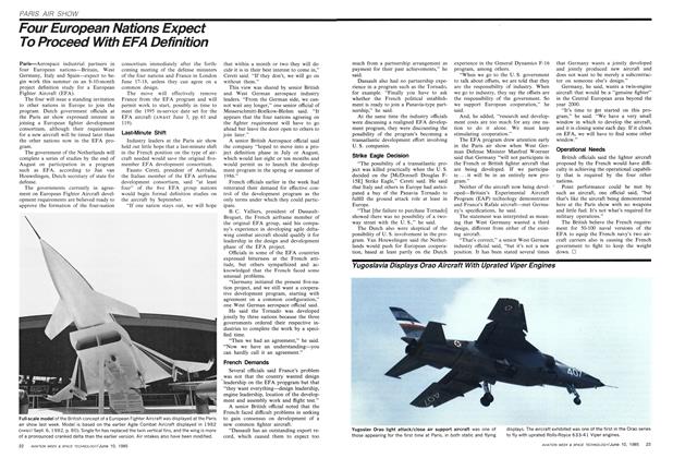 Paris—Aerospace industrial partners in four European nations—Britain, West Germany, Italy and Spain—expect to begin work this summer on an 8-10-month project definition study for a European Fighter Aircraft (EFA). The four will issue a standing invitation to other nations in Europe to join the program.